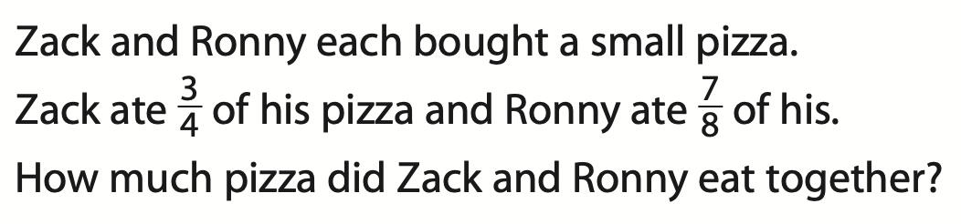 Вроде бы пример из реальной жизни, но не цепляет. Сколько пиццы съели Зак и Ронни вряд ли интересно даже самим Заку и Ронни, особенно в восьмых частях. Получается задачка есть, а реальной задачи нет. Текст – просто фантик для того, чтобы ребёнок сложил две дроби. Честнее было бы спросить напрямую: сколько будет 3/4 + 7/8.Гораздо интереснее (и полезнее), когда есть настоящая задача. Мы действительно что-то хотим узнать, а математика даёт нам ответ.Это может быть пример из жизни: